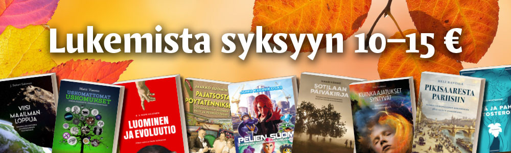 Syksyn pimenevät illat houkuttelevat kirjojen ääreen lämpimään nojatuoliin. Poimimme tarjoukseen virkistävän yli 100 kirjan valikoiman varastomme aarteita. Tutustu ja tilaa lukemista lomalle, iltojen iloksi tai ihan muuten vaan – pikkurahalla. Tarjoukset ovat voimassa 19.10. asti ja yli 60 € tilaukset toimitamme postikuluitta kotimaan osoitteisiin.